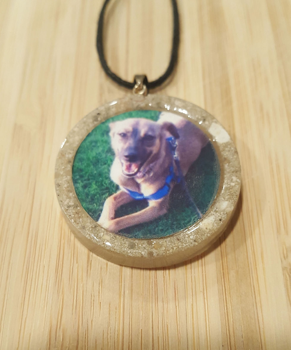 Please note that we purchase the pendant trays, then customize them by adding the photo and ashes with the use of resin. (As shown in the photo on the right)